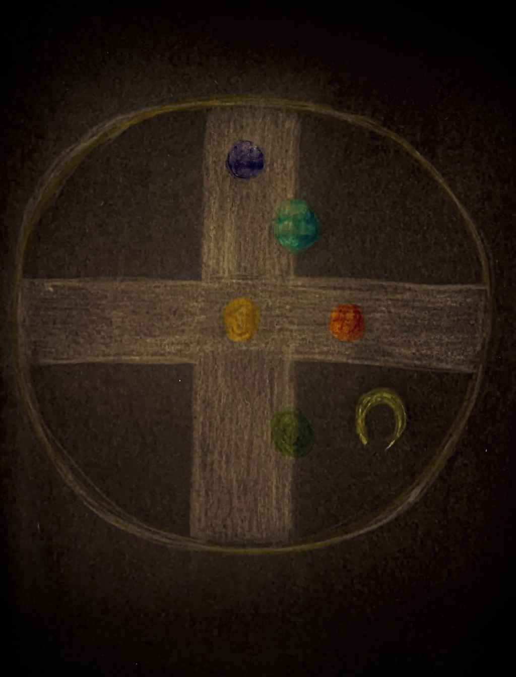 “At the well we are curators of the roads between planets. There are exchanges that need to occur. from the heart of the 9, large exchanges of Ice, Gasses, Minerals, Airs, bright Aethers, Salts, Heats, Humidities. We are the curators of the cargo from the ships, the bright Soular copies of the planet’s bodies. Soma of Mars, Bones of Saturn, Mirror of Venus, Sea of Mercury, Sound of Neptune, Table of Jupiter, Shadow of Pluto, Door of Moons, Openings of Earth. Fill us with bright coins to pay for your traversing in the night. Here the crossed globe becomes the crossed roads. “