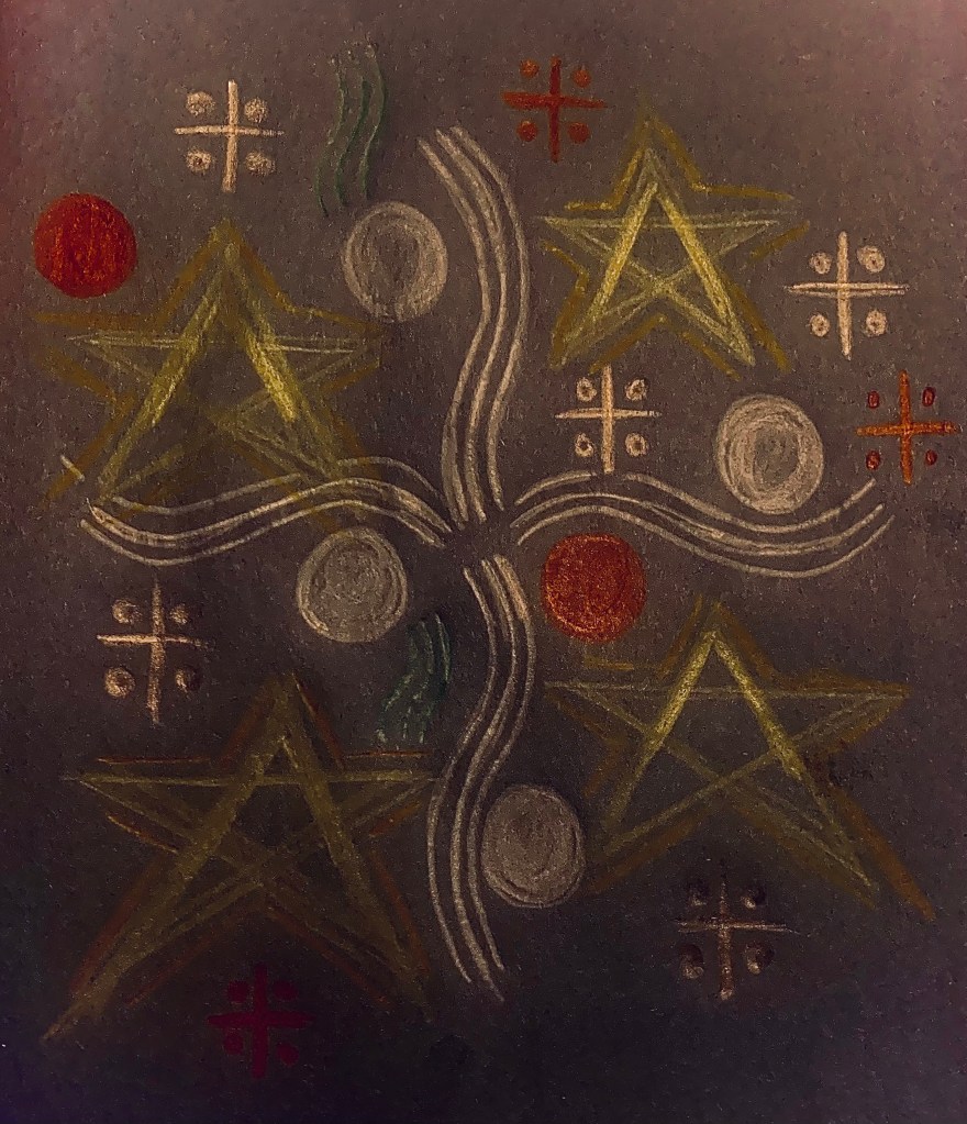 It began with Christ and John the Baptist as magnetic and electric shapes on either sides of a mercurial river which opens into white birds of grace.